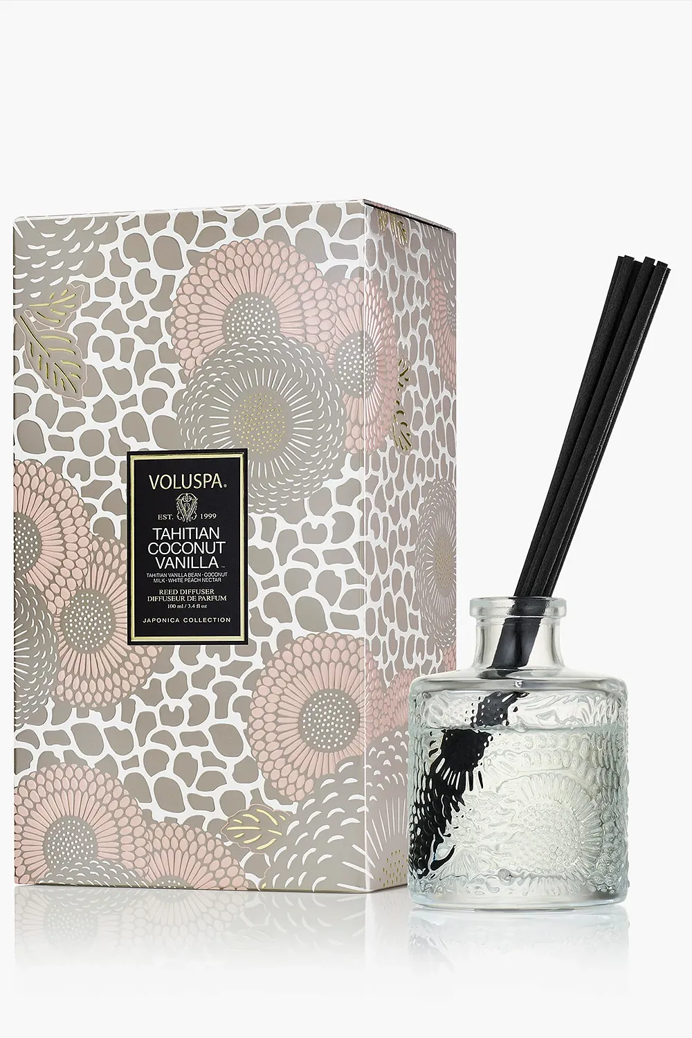 Reed Diffuser fra Voluspa er i duften Tahitian Coconut Vanilla er duftpinner med en duft av tropiske frukter, kokos og vanilje, toppet med jasmin, appelsinblomst og pistasjekrem!